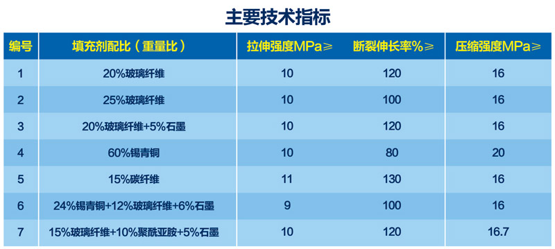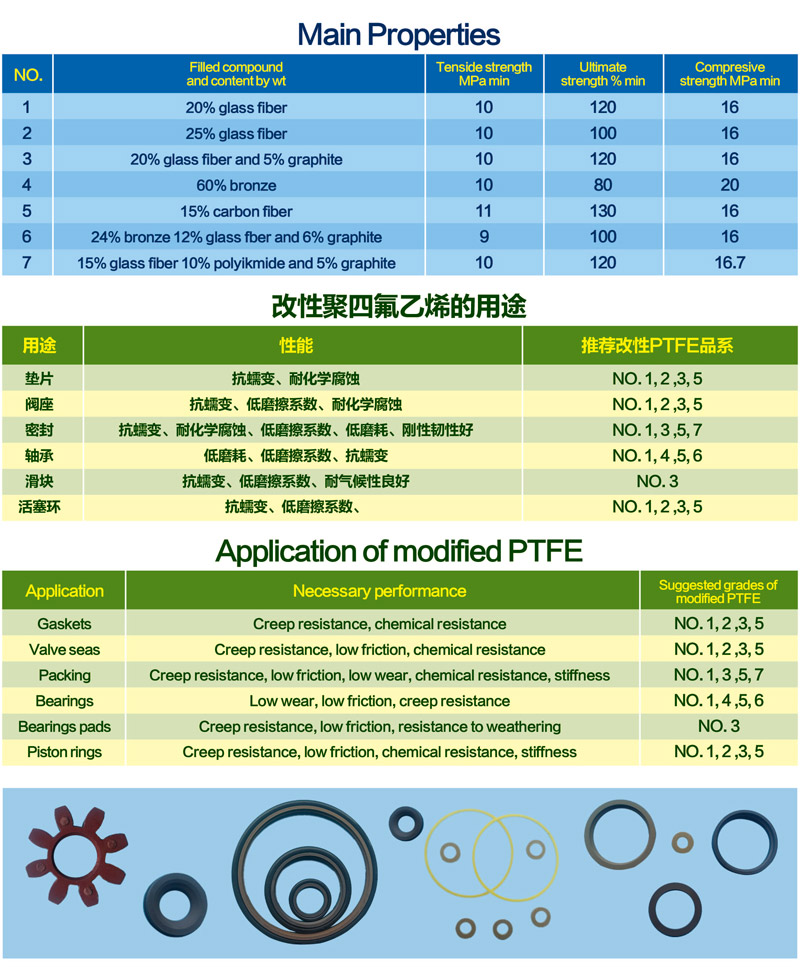 改性聚四氟乙烯制品選用填充聚四氟乙烯樹脂經(jīng)模壓、車削加工而成。懸浮聚合聚四氟乙烯樹脂與各種填充劑經(jīng)高速混合得到改性樹脂。適合與聚四氟乙烯混合的填充劑有高目數(shù)玻璃纖維、碳纖維、銅粉及潤滑劑(石墨、二硫化鉬等),其已在生產(chǎn)中廣泛應(yīng)用。同傳統(tǒng)聚四氟乙烯相比具有更高的壓縮強(qiáng)度、耐磨性、導(dǎo)熱性和抗蠕變性等諸多優(yōu)點(diǎn)。
